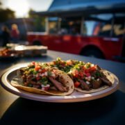 Two (2) tacos served with purple cabbage slaw and sweet plantain bites in a flour tortilla
