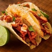 Two (2) tacos served with shredded jerk chicken and purple cabbage slaw in a flour tortilla